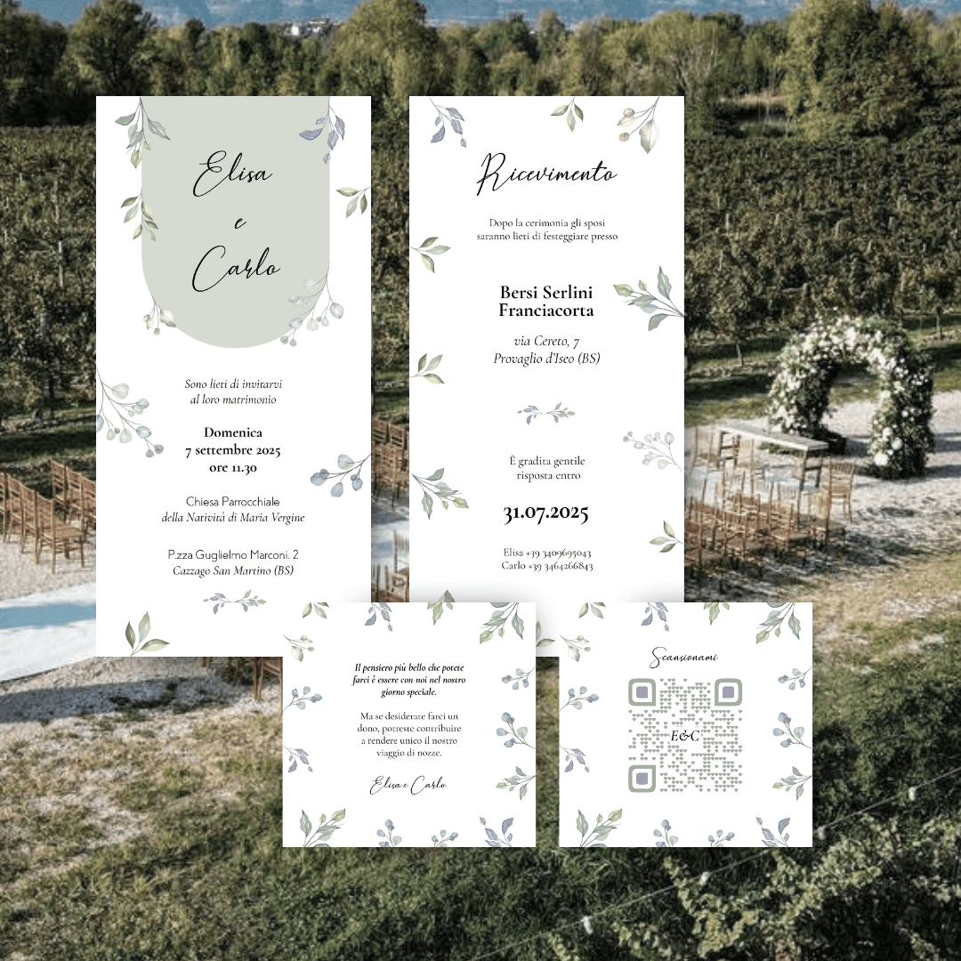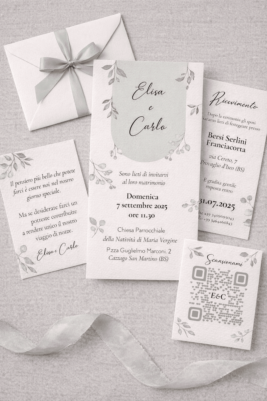 This wedding stationery suite was designed for Elisa and Carlo, with the goal of creating an elegant yet understated visual identity inspired by nature and simplicity. The concept revolves around soft botanical elements, airy layouts, and a muted green palette that evokes calmness, intimacy, and a refined contemporary aesthetic.