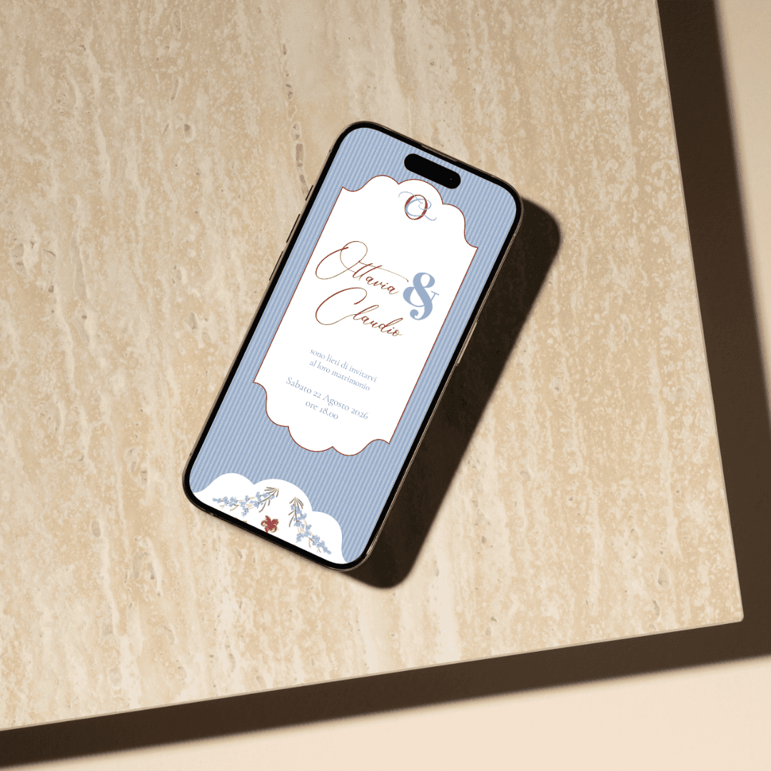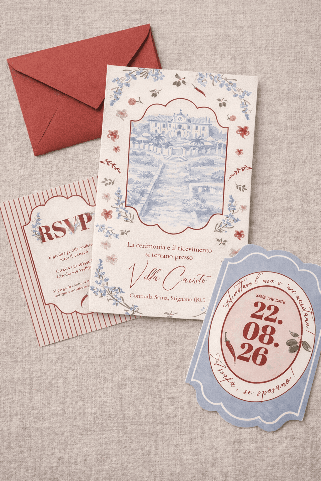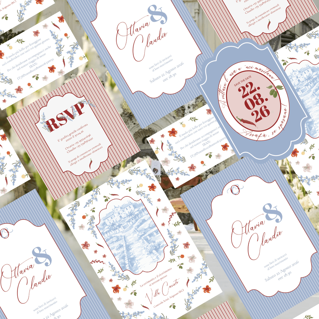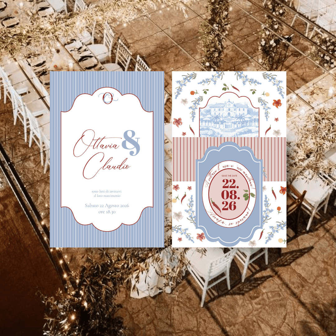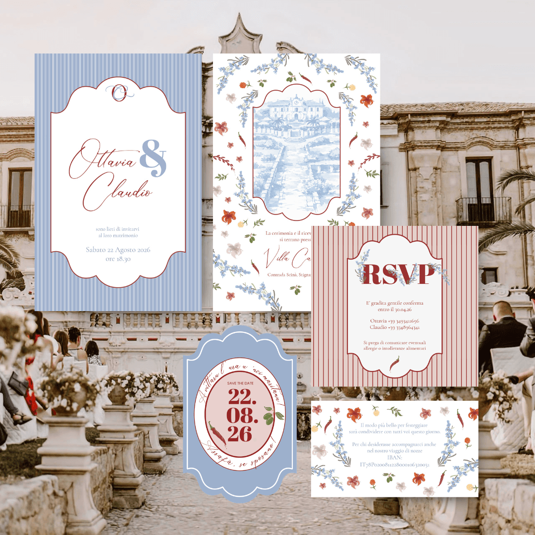 The suite includes the main invitation, RSVP card, and Save the Date. At the heart of the project is a custom illustration of the wedding venue, framed by ornamental shapes and surrounded by hand-drawn floral and symbolic elements. The color palette — powder blue, warm red, soft ivory, and botanical greens — evokes ceramic traditions and sun-washed landscapes, creating a romantic yet distinctive aesthetic.