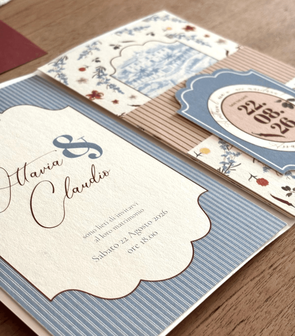 This wedding stationery suite was designed for Ottavia and Claudio, with the intention of capturing the atmosphere of a southern Italian summer celebration. The visual identity draws inspiration from Calabrian and Neapolitan heritage, representing the origins of the bride and groom, Mediterranean colors, and traditional decorative elements, reinterpreted through a refined and contemporary graphic language.